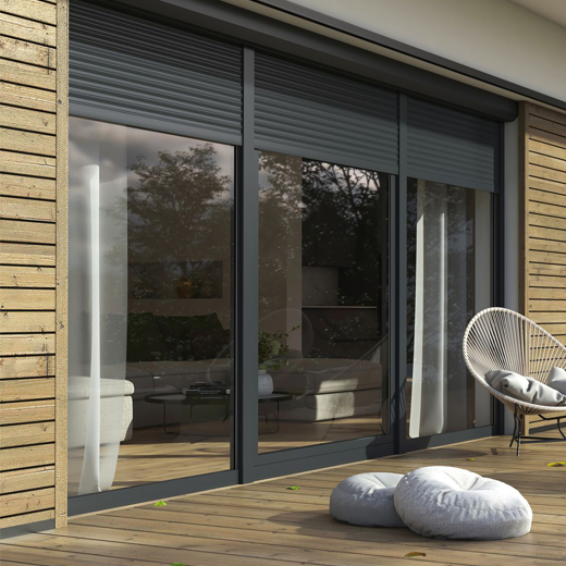 MACO MULTI MATIC KS mit zwei Einbruchsicherungszapfen in Standardausführung; Beschichtung in Silber-Look mit linienförmigen Vertiefungen an den Schiebebeschlägen; optional verdeckte Scharniere in der Einkerbung des Beschlags sowie Lösungen in der Einbruchschutz-Klasse RC 2 und RC 2N, ausgestattet mit einer Fehlbedienungssperre des Fenstergriffs und einem Flügelheber*, Microventilierung**.